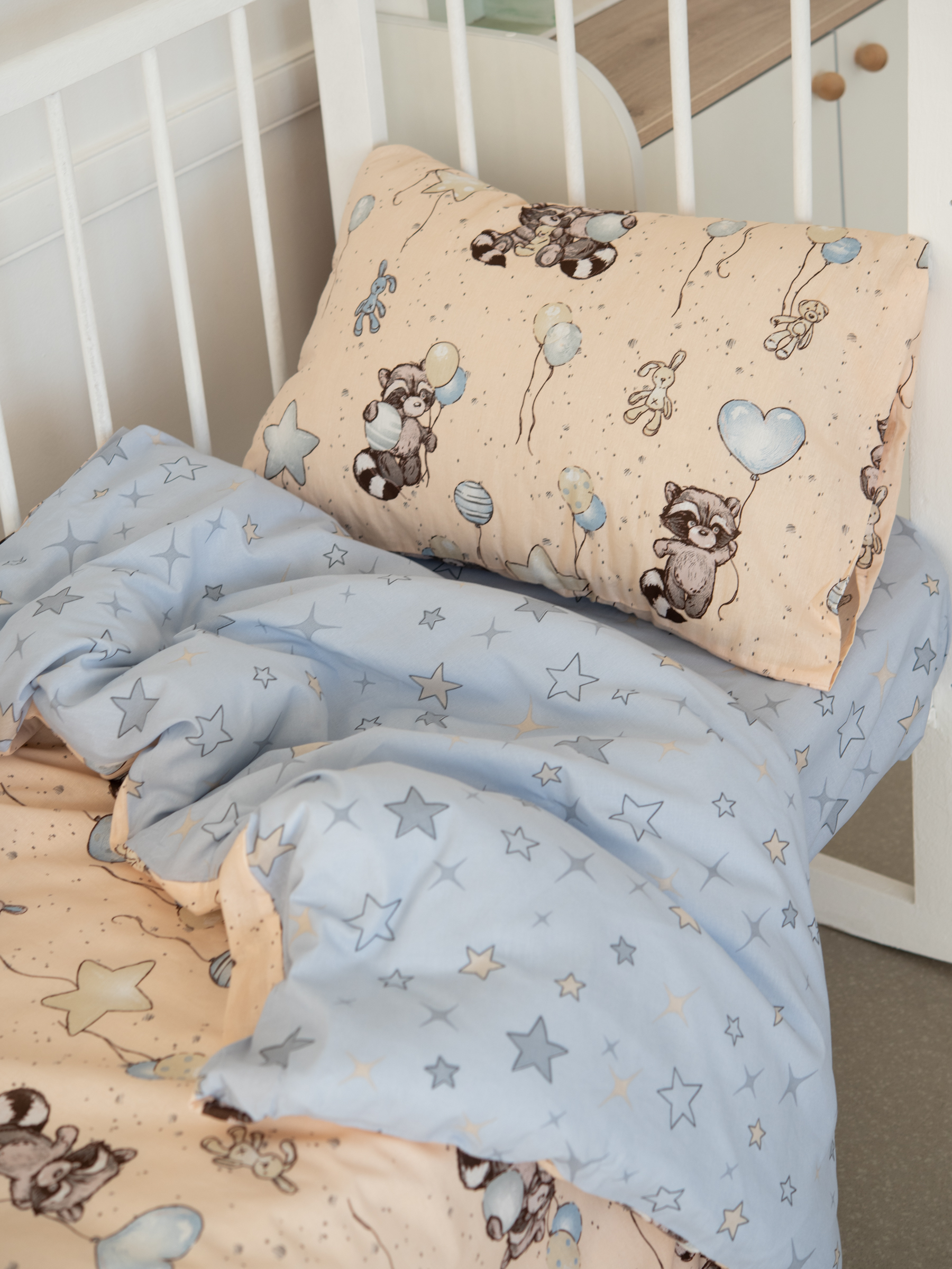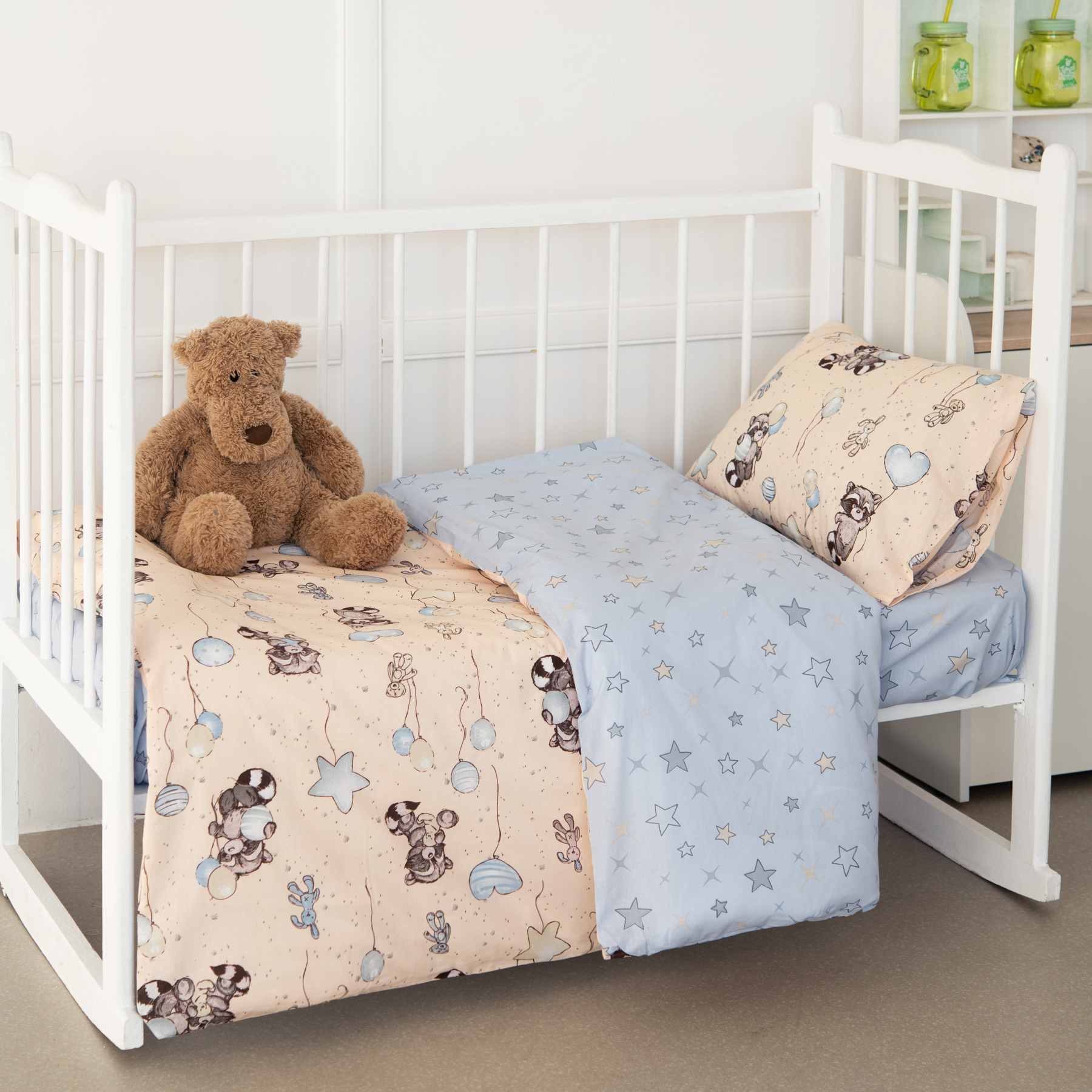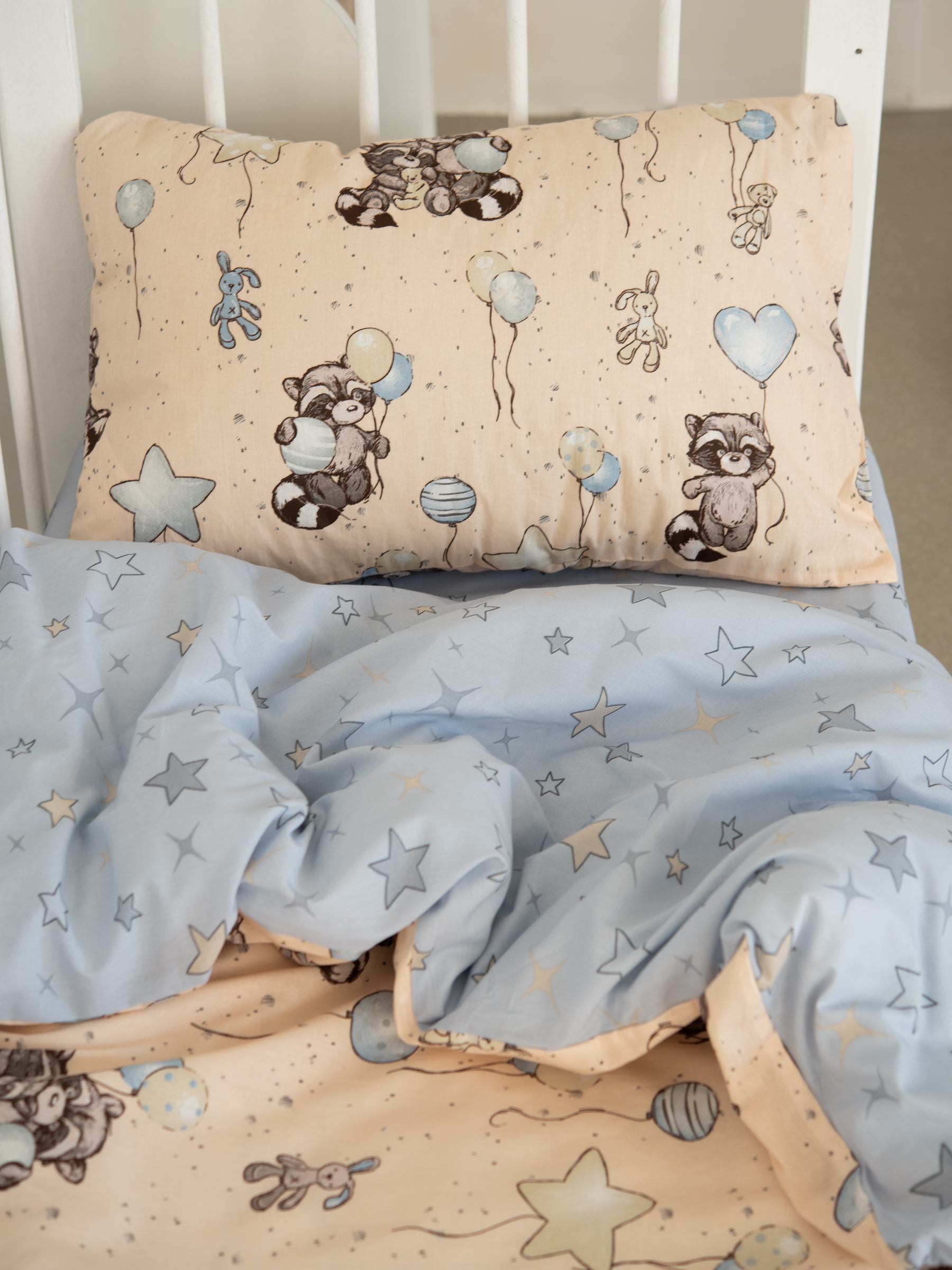 Еноты(беж) КПБ поплин 107*140 с простыней на резинке
