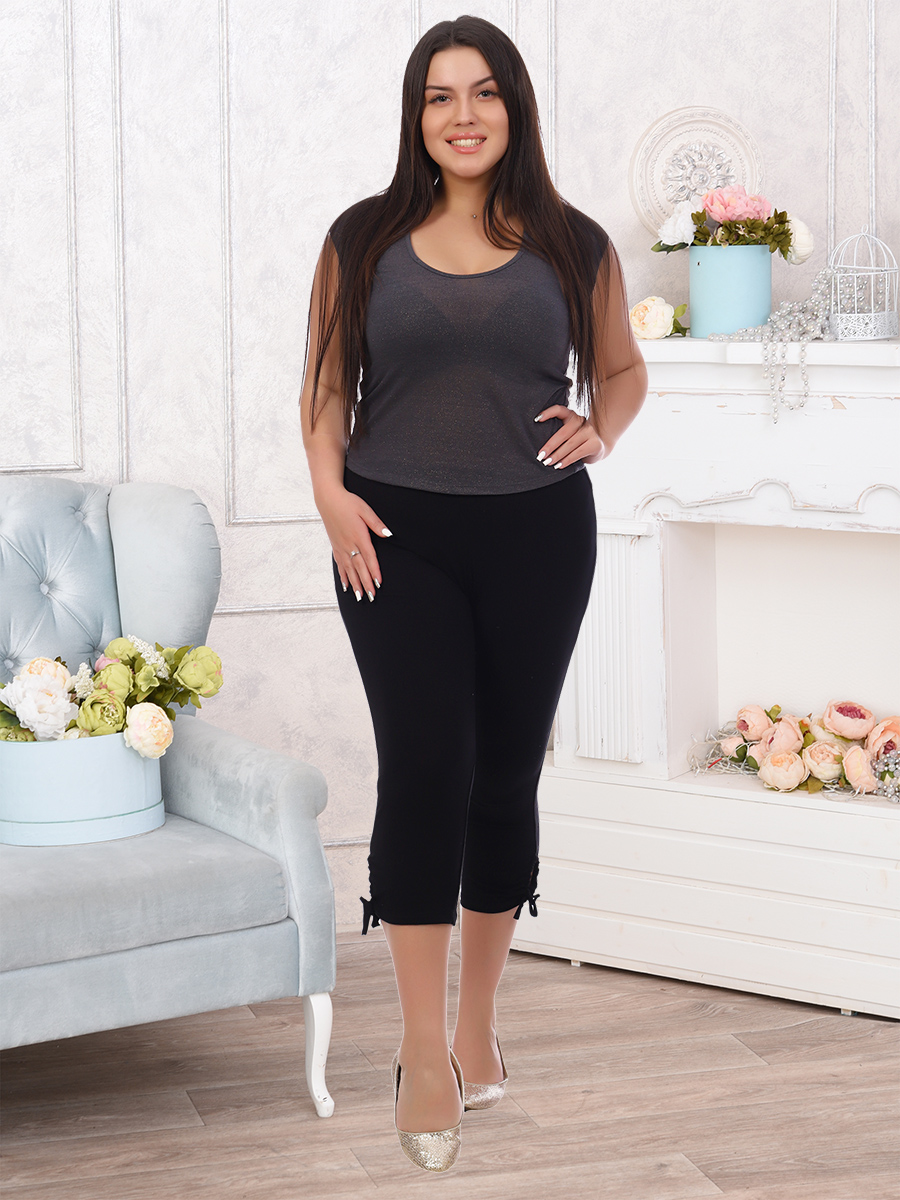Легинсы женские на резинке по линии талии, длиной до середины икры. В боковом шве по низу изделия разрез, который можно стянуть шнуром для более плотного прилегания нижней части легинс к телу.