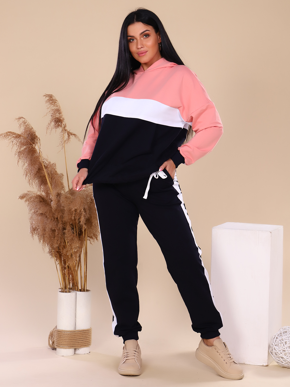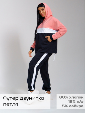Костюм из футера в модных сочетаниях цветов. На куртке двойной капюшон, карман-кенгуру и кулиса со шнуром. Брюки с лампасами и карманами в боковых швах. Манжеты и пояс брюк из кашкорсе.