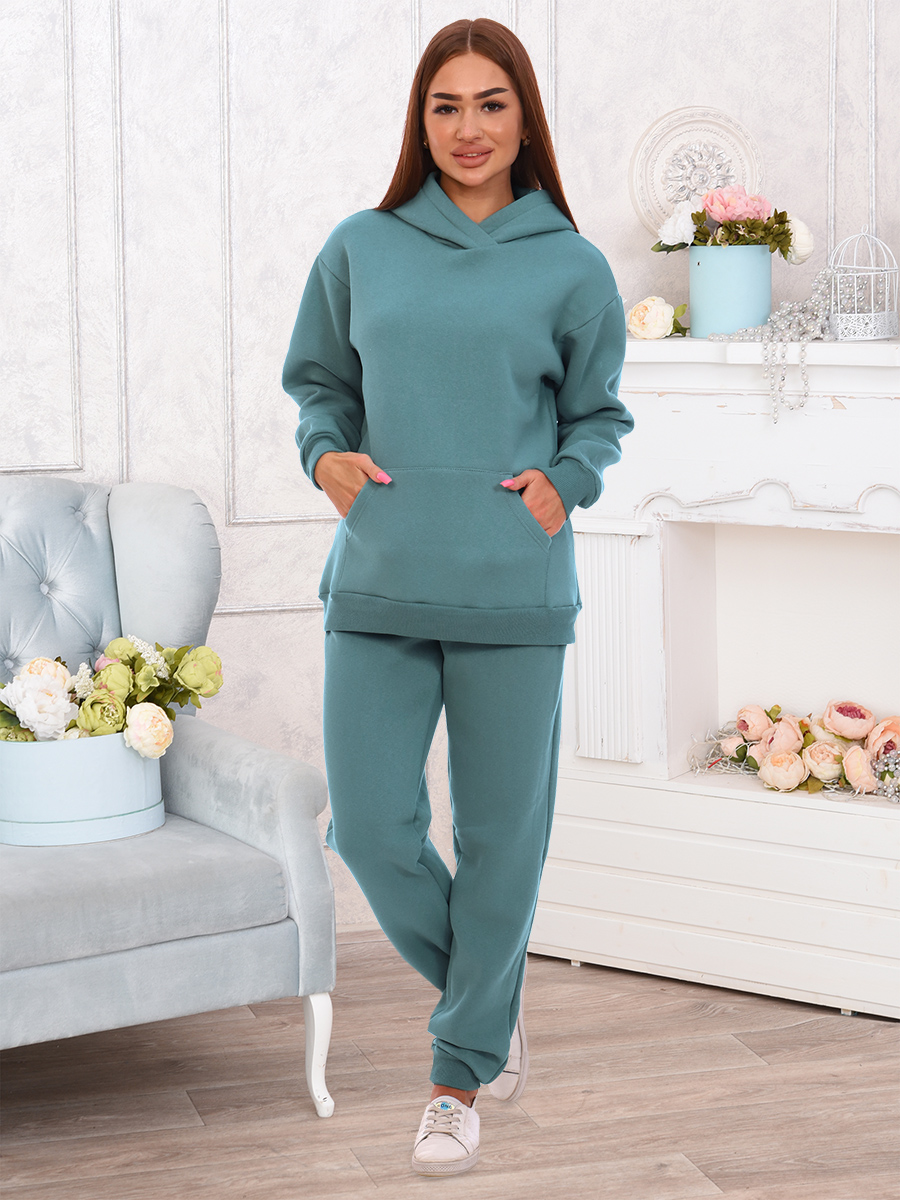 Костюм женский. Куртка со спущенным рукавом на манжете, двойным капюшоном и накладным карманом. Брюки на притачном поясе с резинкой, по низу изделия манжета. На передней части брюк - карманы.
