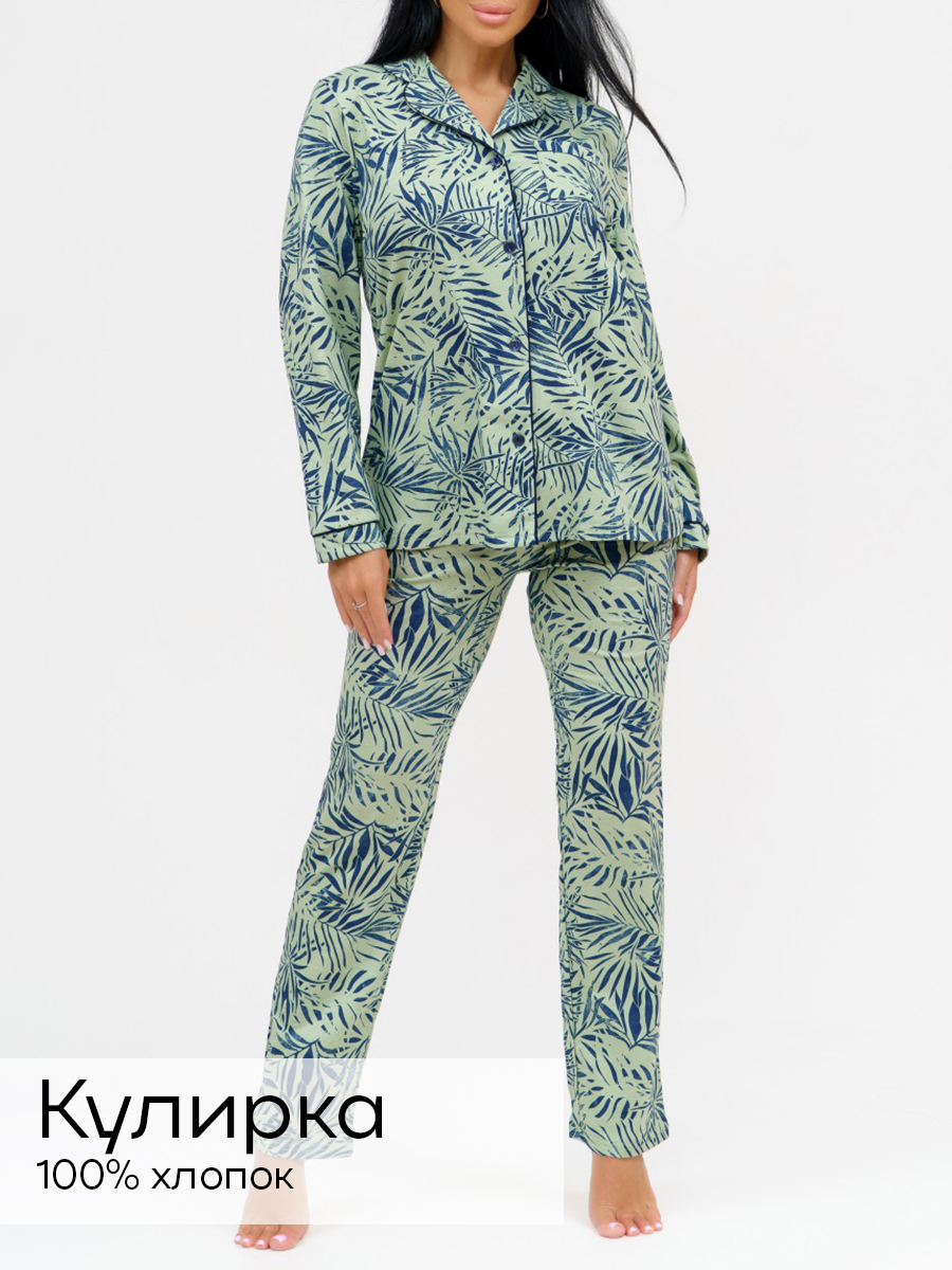 Костюм из жакета и брюк свободного покроя. Брюки на резинке прямого покроя. Жакет с длинным рукавом и воротником пиджачного типа на 4 пуговицах. На детали переда 2 кармана. Воротник с рукавами и карманами обработаны окантовочной тесьмой