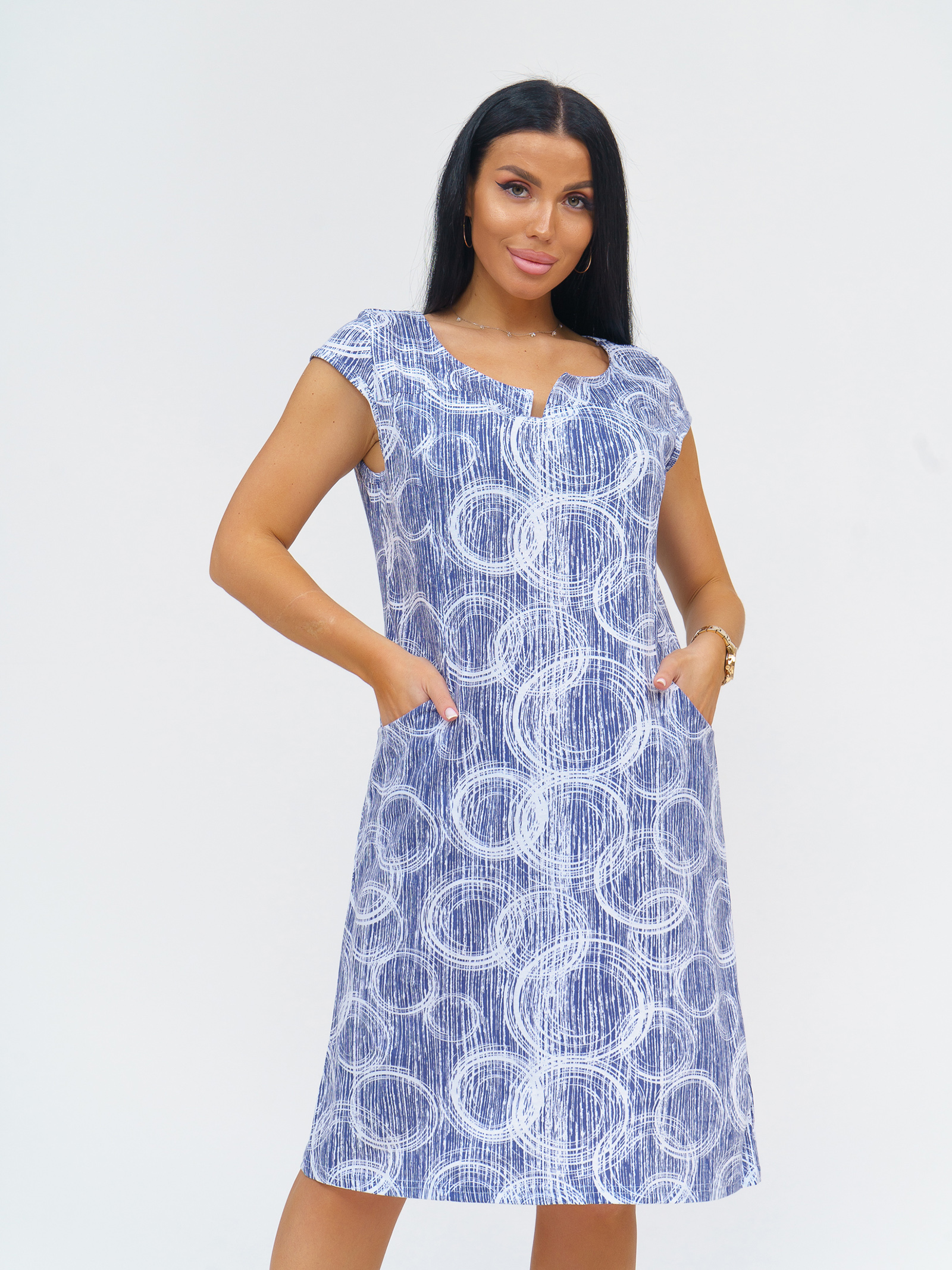 Изящное женское платье с оригинальным вырезом и рукавом-крылышком. Силуэт прямой, имеются фигурные карманы.
