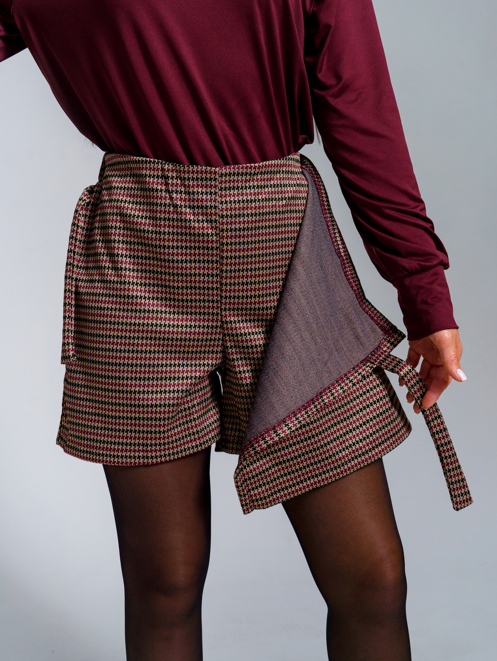 Юбка-шорты женские укороченные из костюмной ткани, спереди декоративный запах, фиксирующийся завязкой. Регулировка талии по спинке резинкой.