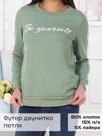 Толстовка женская из набивного футера. Манжеты, горловина и пояс из кашкорсе. На детали переда печать.