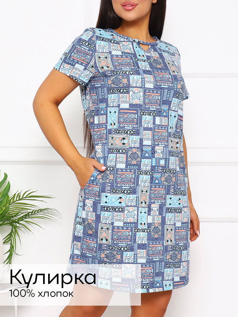 Туника женская прямого покроя. На горловине переда декоративный разрез. Вырез горловины в форме «лодочки». В боковом шве — карманы.