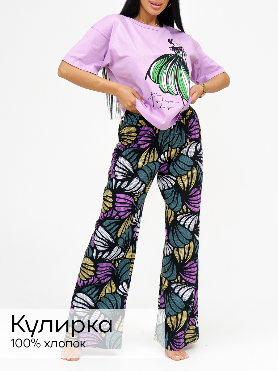 Комплект из широких брюк без бокового шва и оригинальной футболки с печатью. Пояс брюк отстрочен на спецмашине. Срезы футболки подшиты на плоскошовке.