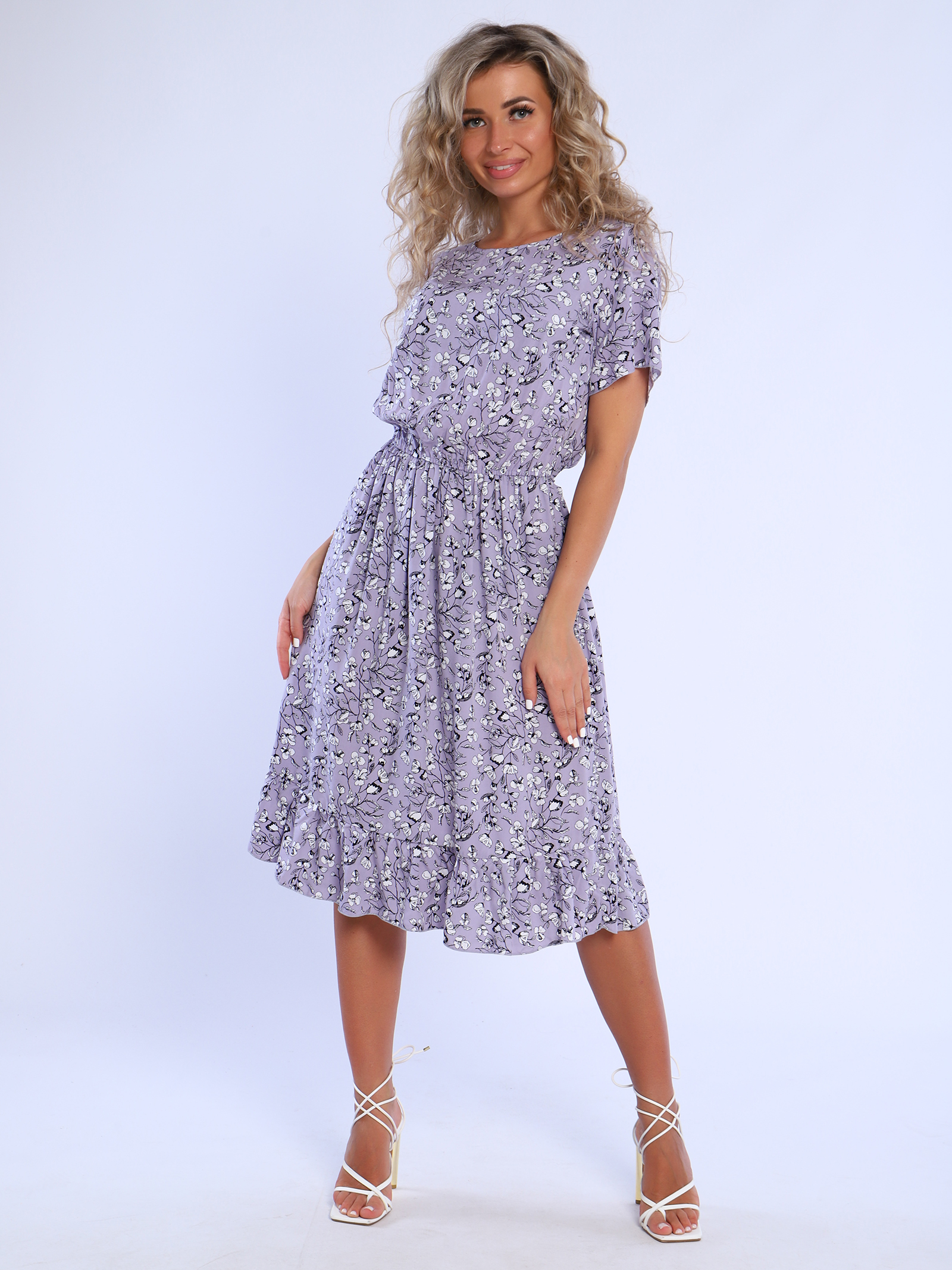 Платье из штапеля с красивым воланом по низу. Горловина платья подшита на прямострочке. Талия подчеркнута резинкой. Низ рукава и низ платья обработаны декоративной строчкой.