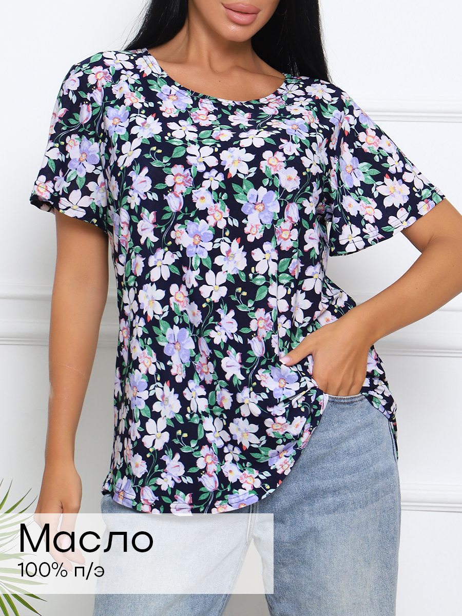 Туника женская с круглым вырезом горловины и коротким рукавом. Низ туники, горловина, низ рукава обработаны швом вподгибку.