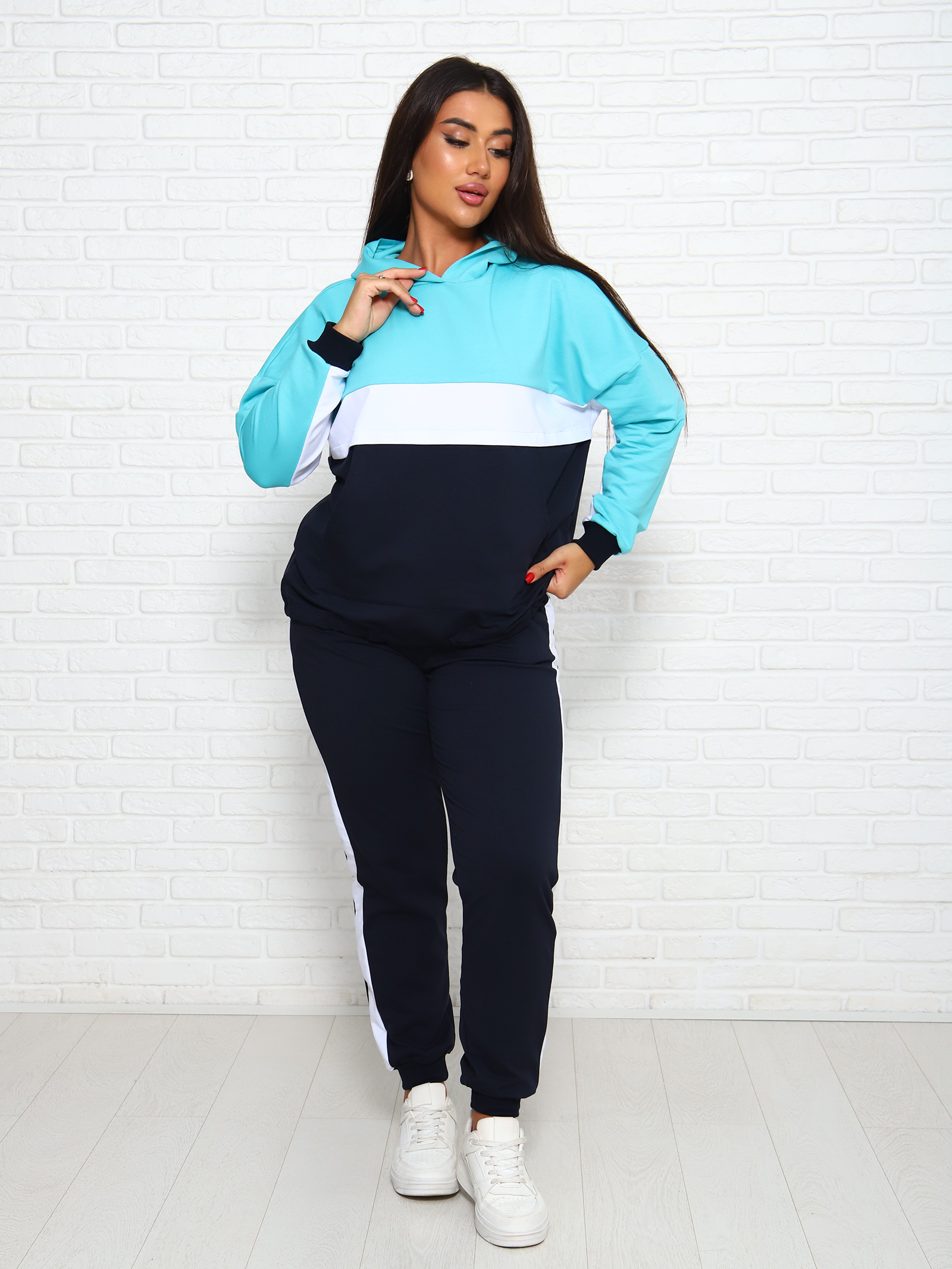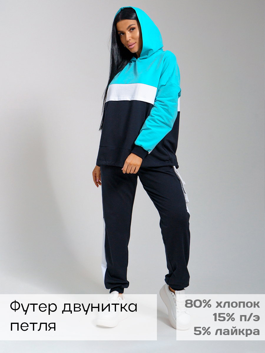Костюм из футера в модных сочетаниях цветов. На куртке двойной капюшон, карман-кенгуру и кулиса со шнуром. Брюки с лампасами и карманами в боковых швах. Манжеты и пояс брюк из кашкорсе.