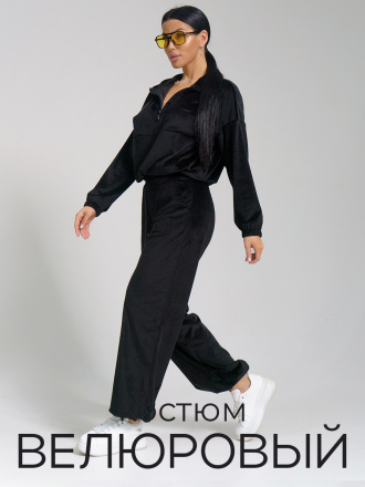 Костюм оверсайз с толстовкой на молнии и брюками изготовлен из приятного велюра, который дарит свободу движений и комфорт. Низ рукавов и брюк на резинке, в боковых швах брюк карманы.