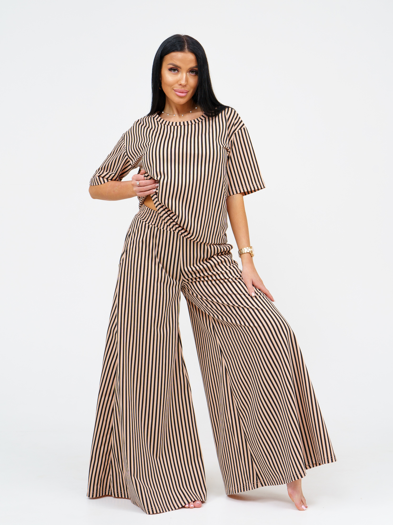 Комплект из широких брюк-палаццо с карманами и футболки со спущенными рукавами — идеальное сочетание свободы движений и изящного комфорта. Выполненный из мягкой и дышащей кулирки (100% хлопок), этот комплект подарит вашим клиентам ощущение лёгкости и непринуждённости в течение всего дня. Широкий размерный ряд от 44 до 58 и пять стильных расцветок позволят подобрать образ для любой фигуры и настроения. Этот универсальный комплект прекрасно подходит для домашних вечеров, прогулок по парку, занятий йогой или повседневных городских образов — всегда обеспечивая уют и стиль одновременно. Оптовым покупателям мы предлагаем отличный шанс пополнить ассортимент изделиями, которые совмещают комфорт, практичность и современную эстетику.