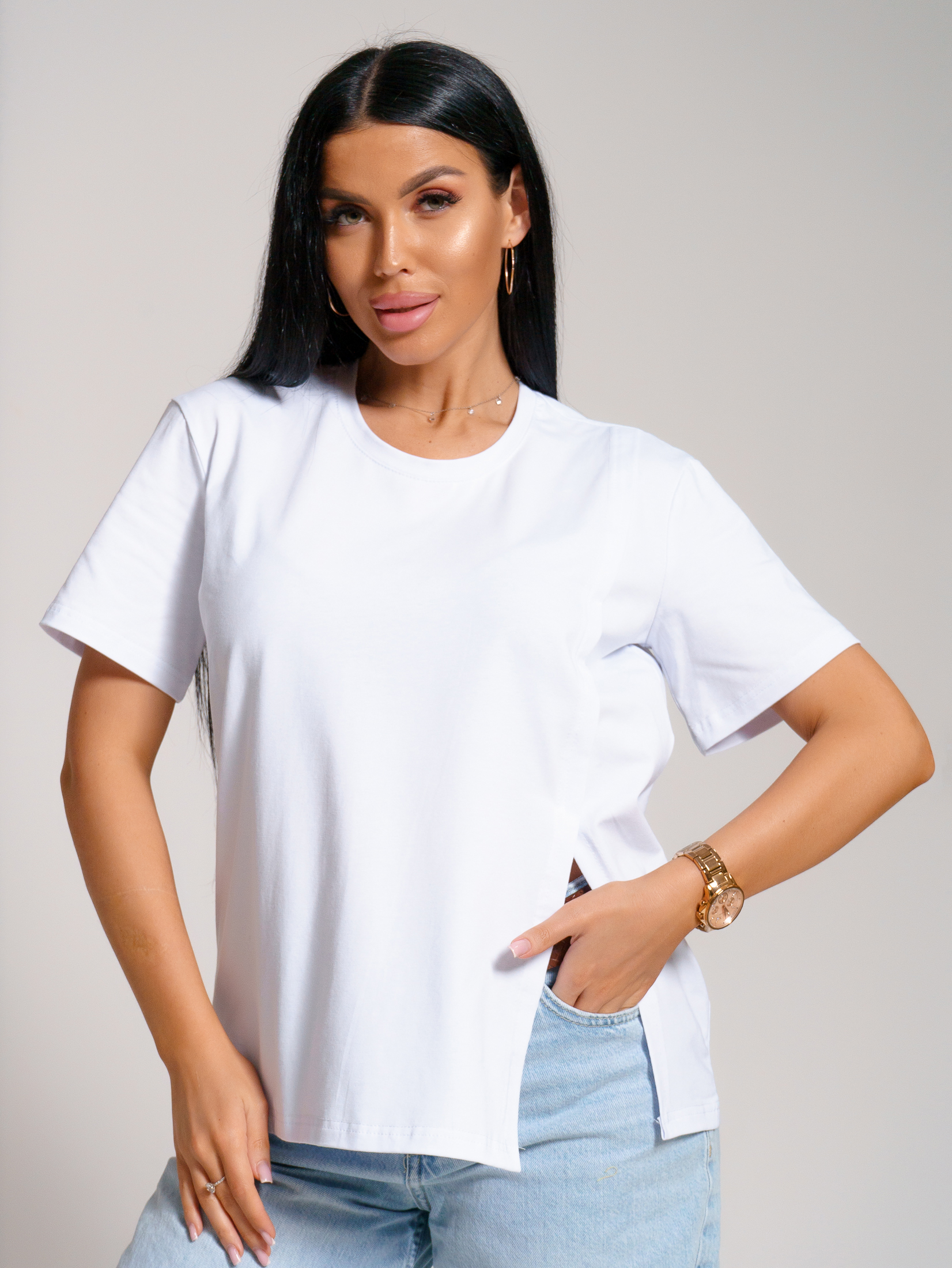 Футболка женская с коротким рукавом и декоративным разрезом на передней части изделия. Горловина круглой формы.