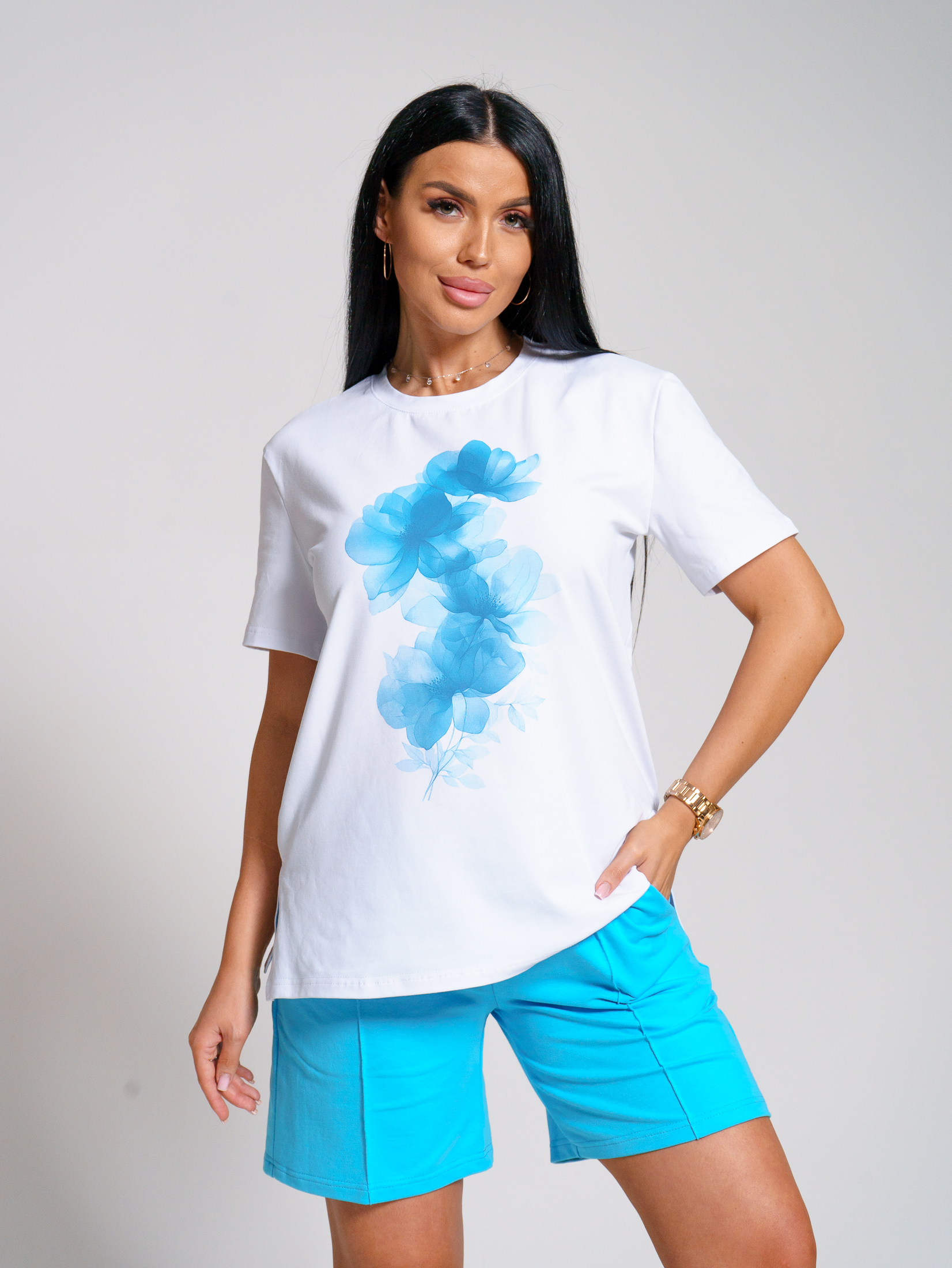Костюм из футболки и шорт. Футболка с разрезами в боковых швах и бейкой по горловине, на детали переда печать. Шорты свободного кроя с карманами и стрелками, пояс отстрочен. Состав футболки: 95% хлопок, 5% эластан, шорт: 75% хлопок, 20% ПЭ, 5% эластан.