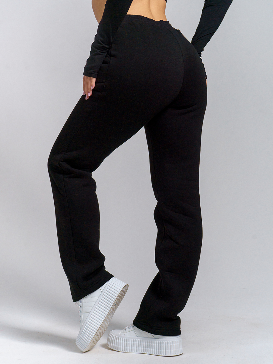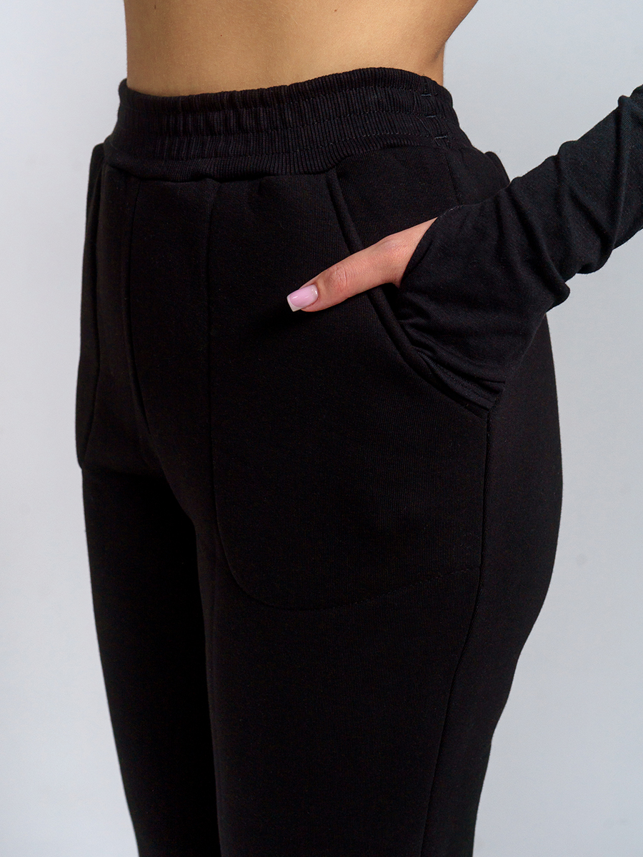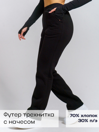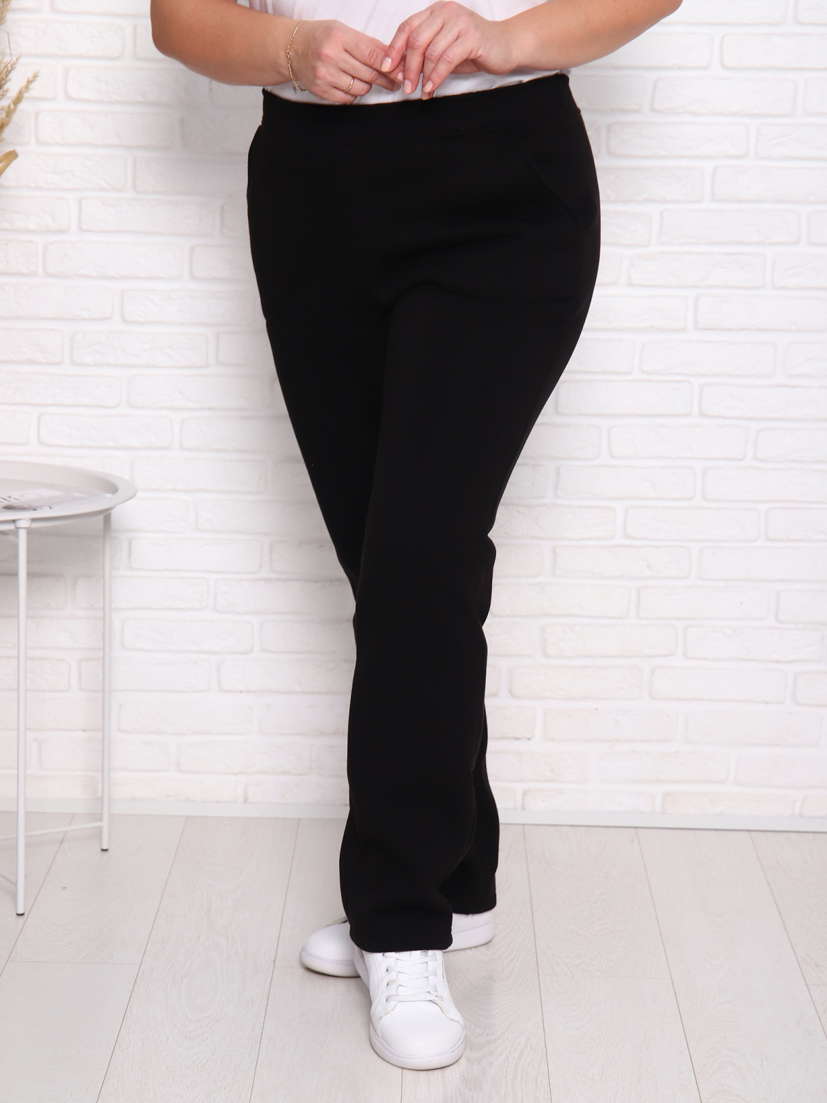 Брюки женские прямого силуэта с карманами из футерного полотна с начесом. Пояс из кашкорсе в цвет основной ткани отстрочен вместе с резинкой.