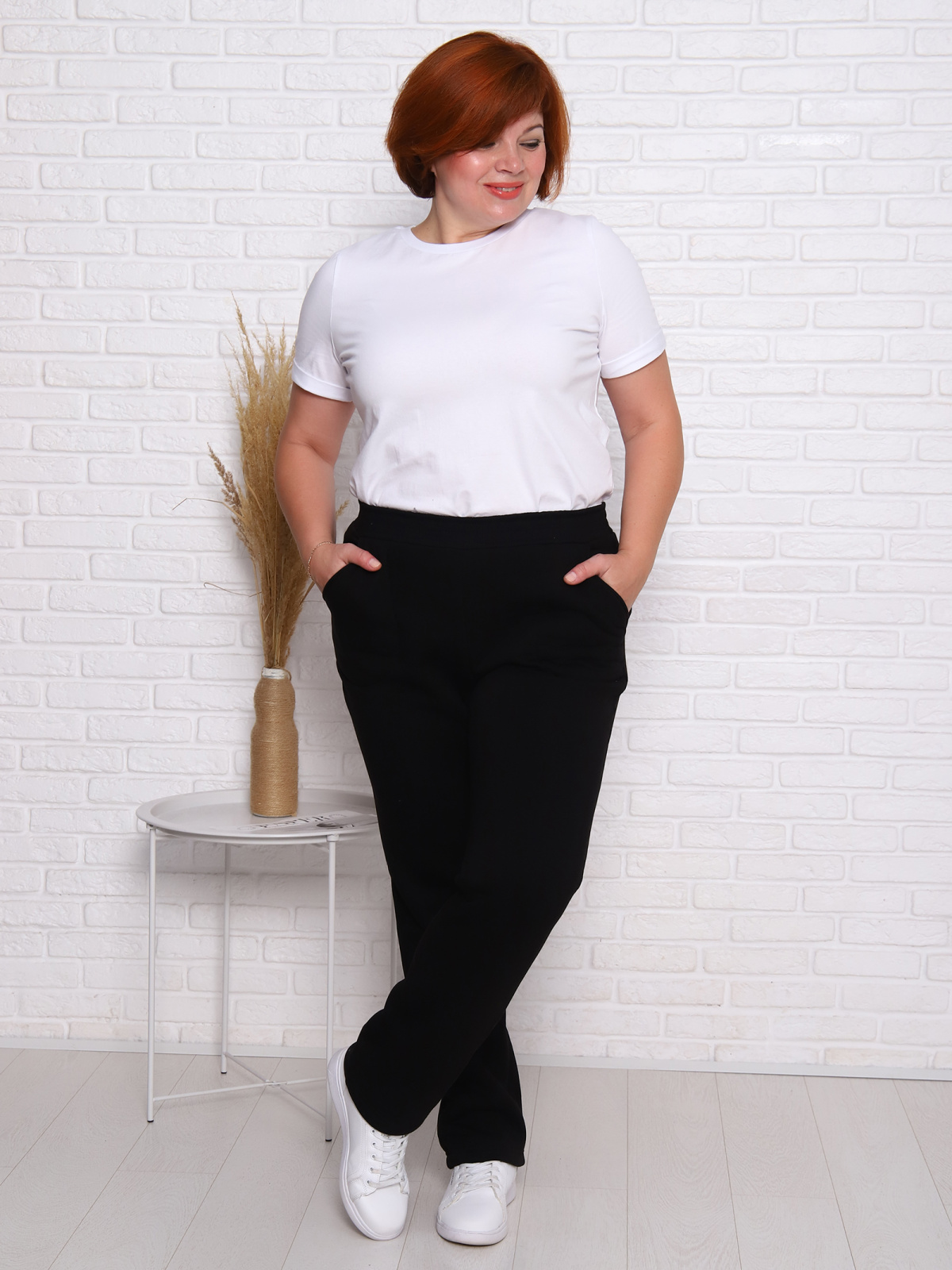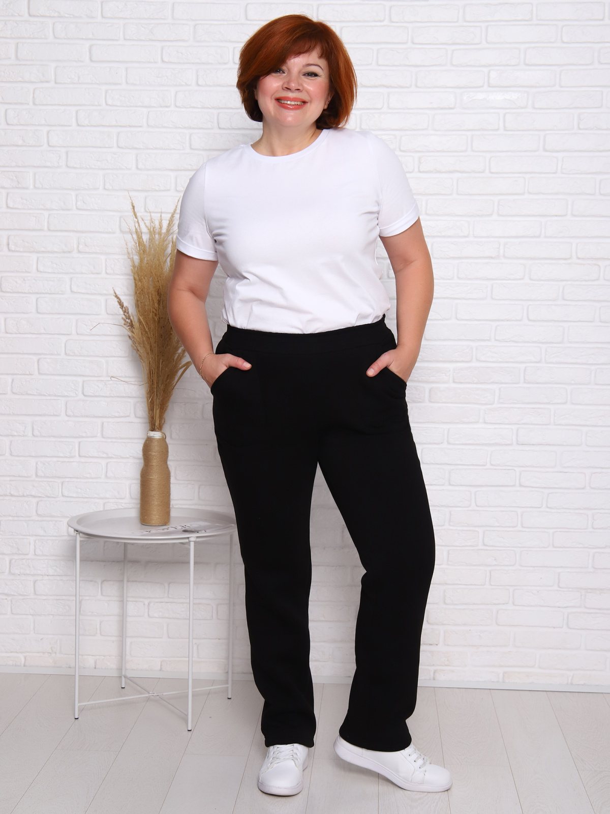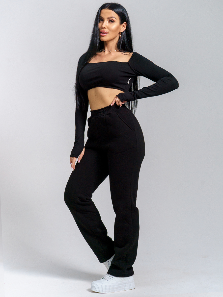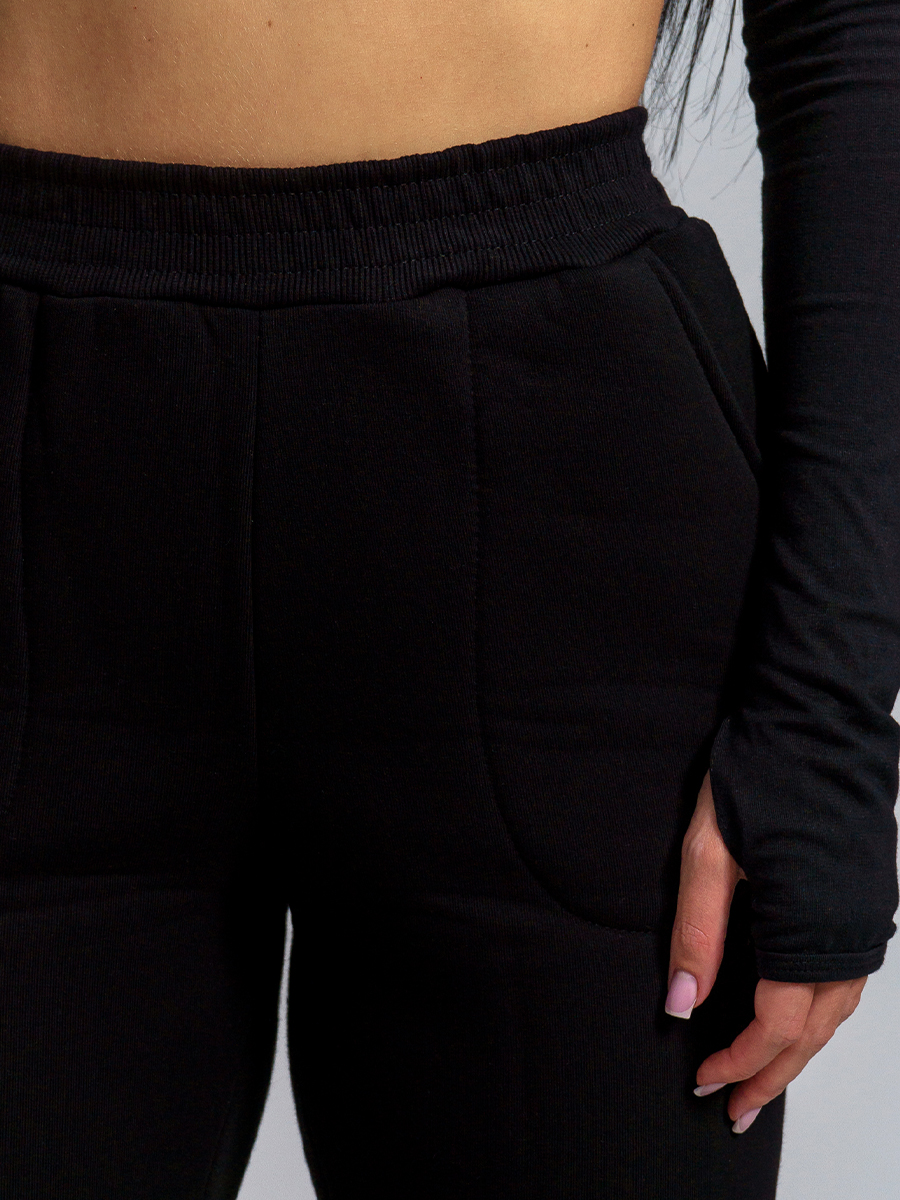 Брюки женские прямого силуэта с карманами из футерного полотна с начесом. Пояс из кашкорсе в цвет основной ткани отстрочен вместе с резинкой.