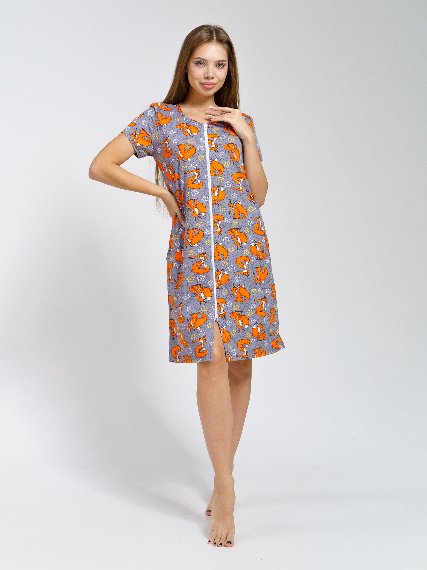 Женский халат на молнии с тематическим принтом, боковыми карманами и коротким рукавом.