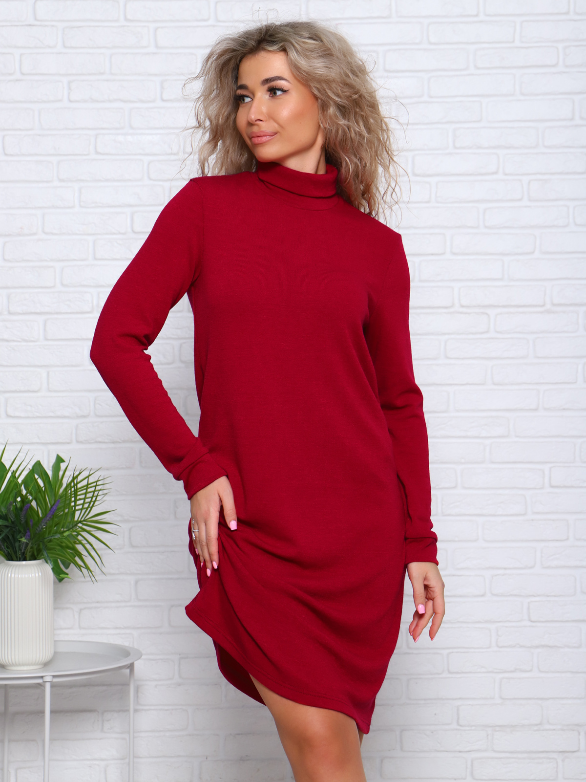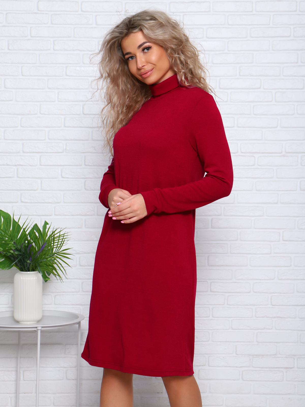Платье облегающего силуэта из мягкого струящегося трикотажа с длинным рукавом и воротником стойкой. Низ платья подшит плоским швом. Низ рукавов на манжете.